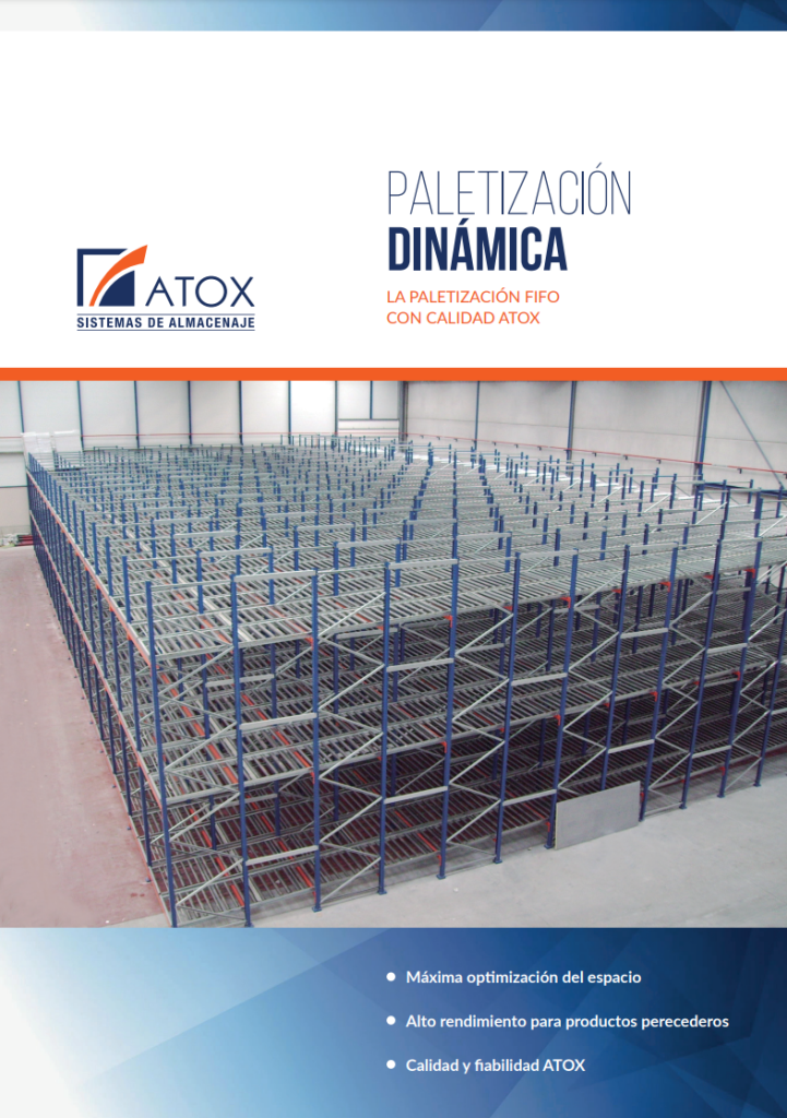 Estanterías dinámicas diseñadas para el almacenamiento de productos paletizados a las que incorporamos caminos de rodillos con ligera pendiente, por los que se desplazan los palets por acción de la gravedad.